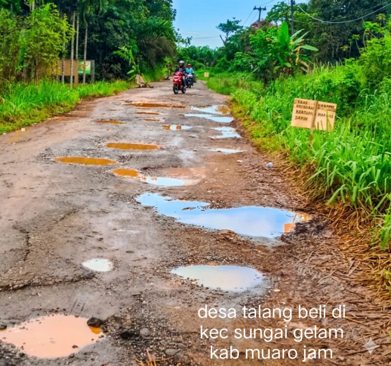 Kondisi jalan penghubung Desa Talang Belido dan Desa Ladang Panjang, Kecamatan Sungai Gelam, Kabupaten Muaro Jambi, dilaporkan masih rusak parah dan belum mendapat perbaikan signifikan hingga saat ini.