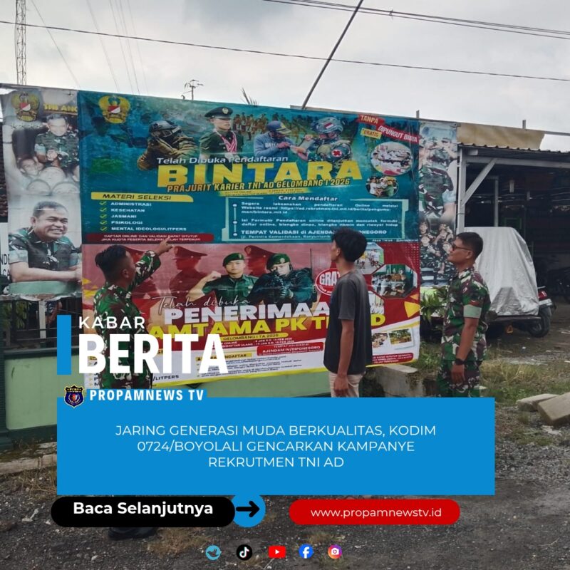 Boyolali, // PropamNewstv.id — Jajaran Koramil di bawah naungan Kodim 0724/Boyolali gencar melaksanakan kampanye rekrutmen Tamtama dan Bintara TNI Angkatan Darat dengan memasang spanduk serta membagikan brosur dan poster kepada masyarakat, (17/01/2026).