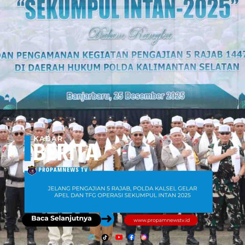 Kalimantan Selatan //propamnewstv.id – Menjelang pelaksanaan pengajian rutin memperingati 5 Rajab 1447 Hijriah, Kepolisian Daerah Kalimantan Selatan (Polda Kalsel) menggelar Apel Gelar Pasukan dan Tactical Floor Game (TFG) Operasi Sekumpul Intan 2025. Kegiatan ini digelar di Lapangan Murjani Banjarbaru, Kamis (25/12/2025) sore.