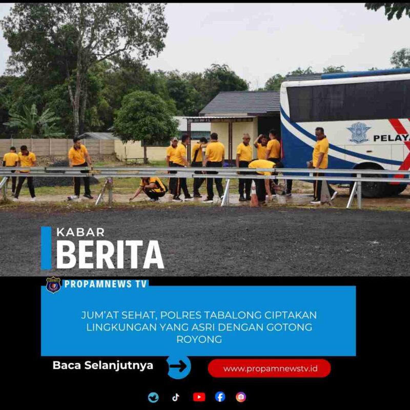 Tabalong, // PropamNewstv.id – Usai apel pagi, Polres Tabalong melaksanakan kegiatan gotong royong dalam rangka mewujudkan lingkungan yang bersih dan nyaman di lingkungan Polres Tabalong, Pembataan, Kelurahan Pembataan, Kecamatan Murung Pudak, Kabupaten Tabalong, Jum’at (06/02/2026) pagi.