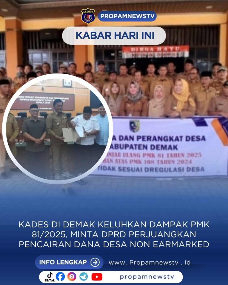 Demak // propamnewstv.id — Sejumlah kepala desa dan perangkat desa di Kabupaten Demak, Jawa Tengah mendatangi Kantor DPRD Demak untuk meminta solusi dan dukungan terkait terhambatnya pencairan Dana Desa non-earmarked. Hambatan tersebut muncul setelah terbitnya Peraturan Menteri Keuangan (PMK) Nomor 81 Tahun 2025 yang merupakan perubahan dari PMK 108 Tahun 2024.
