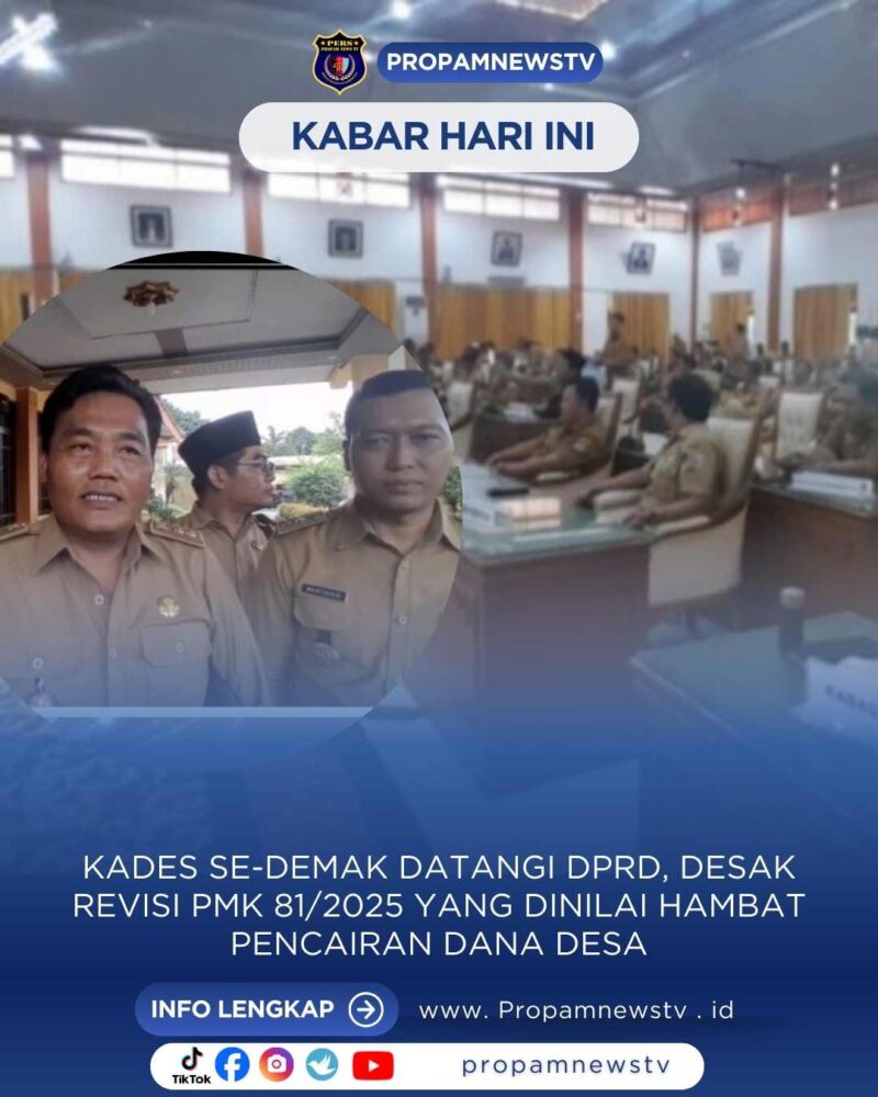 Demak // propamnewstv.id — Sejumlah kepala desa dan perangkat desa dari berbagai wilayah di Kabupaten Demak, Jawa Tengah mendatangi Kantor DPRD Demak untuk menyampaikan aspirasi terkait terhambatnya pencairan Dana Desa non-earmarked akibat terbitnya Peraturan Menteri Keuangan (PMK) Nomor 81 Tahun 2025, yang merupakan perubahan dari PMK 108 Tahun 2024.