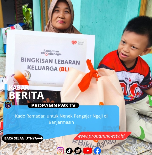 Banjarmasin, // PropamNewstv.id – 23 Februari 2026 – Rumah Zakat Kalimantan Selatan membagikan paket 7 Bingkisan Lebaran Keluarga (BLK) kepada sejumlah keluarga dhuafa di Kota Banjarmasin. Salah satu penerima manfaat adalah Nenek Jum’ah, warga Jalan Sungai Miai RT 10, yang sehari-hari dikenal sebagai guru ngaji keliling.