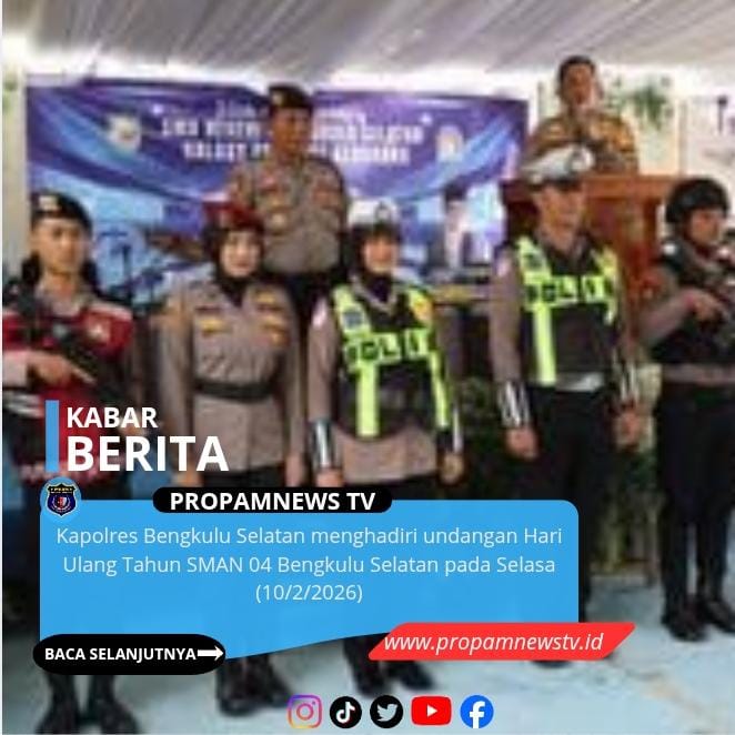 Kapolres Bengkulu Selatan, // PropamNewstv.id – Menghadiri undangan Hari Ulang Tahun SMAN 04 Bengkulu Selatan pada Selasa (10/2/2026) pukul 08:00 Wib s/d Selesai. Kehadiran Kapolres ini merupakan bentuk dukungan dan kepedulian terhadap dunia pendidikan di Bengkulu Selatan.