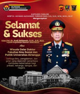 JABAR //propamnewstv.id/– Keluarga besar Polres Cianjur menyampaikan rasa bangga dan apresiasi atas capaian akademik Kepala Kepolisian Daerah Jawa Barat, Rudi Setiawan, yang berhasil meraih gelar Doktor dari Universitas Airlangga. Sabtu 11 April 2026 cianjur. Ucapan selamat dan sukses tersebut disampaikan langsung oleh Kapolres Cianjur, Akhmad Alexander Yurikho Hadi, S.H., S.I.K., M.Si., M.M., M.H.I., M.I.P. bersama seluruh jajaran Polres Cianjur sebagai bentuk penghargaan atas dedikasi dan komitmen Kapolda dalam meningkatkan kapasitas diri melalui pendidikan tinggi.