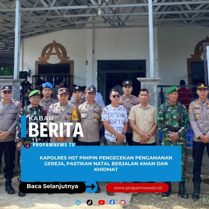 Kalimantan //propamnewstv.id – Polres Hulu Sungai Tengah Polda Kalimantan Selatan – Dalam rangka memastikan perayaan Natal berlangsung aman, tertib, dan penuh khidmat, Kapolres Hulu Sungai Tengah (HST) AKBP Jupri JHP Tampubolon, S.I.K., M.Si memimpin langsung kegiatan pengecekan serta monitoring kesiapan pengamanan di sejumlah gereja yang berada di wilayah Kabupaten Hulu Sungai Tengah, Kamis (25/12/2025).