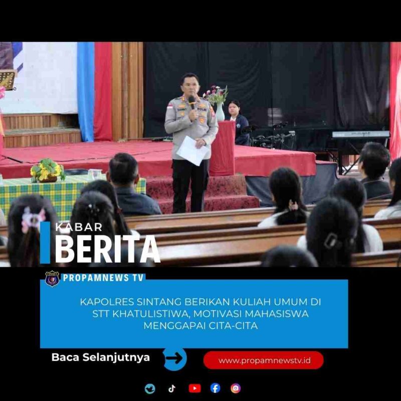 SINTANG, // PropamNewstv.id – Kapolres Sintang, AKBP Sanny Handityo, S.H., S.I.K., memberikan kuliah umum kepada mahasiswa Sekolah Tinggi Teologi (STT) Khatulistiwa Sintang pada Senin pagi (26/1/2026). Kegiatan yang berlangsung di aula kampus tersebut mengusung tema strategis, yaitu “Hamba Tuhan dalam Kehidupan Sosial Kemasyarakatan”.