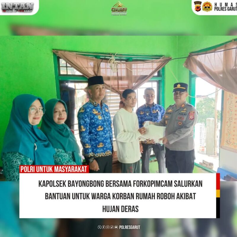 Dalam kegiatan tersebut, Kapolsek bersama Camat Bayongbong, Kepala Desa Bayongbong, dan perwakilan PKK Kecamatan Bayongbong menyalurkan bantuan berupa 10 kilogram beras, satu dus mie instan, serta atap terpal untuk kebutuhan darurat warga yang rumahnya rusak.