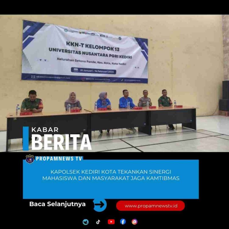 Kediri, // PropamNewstv.id – Kepolisian Sektor Kediri Kota melalui Bhabinkamtibmas Kelurahan Setonopande menghadiri kegiatan pembukaan Kuliah Kerja Nyata Tematik (KKN-T) Kelompok 13 Universitas Nusantara PGRI (UNP) Kediri tahun 2026. Kegiatan tersebut digelar di Gedung Graha Abdi Praja, Kantor Pemerintahan Kelurahan Setonopande, Jalan Sultan Agung No. 55 Kota Kediri, Kamis (22/1/2026) pagi.