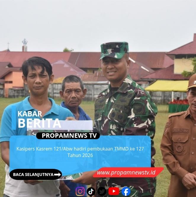 Sintang, // PropamNewstv.id – Kasipers Kasrem 121/Abw Letkol Arh Agus Nur Fujianto, S.I.P., M.Han., mewakili Danrem 121/Abw menghadiri upacara pembukaan TNI Manunggal Membangun Desa (TMMD) ke 127 Tahun 2026 Kodim 1205/Sintang, bertempat di Lapangan Kodim 1205/Sintang, Kalimantan Barat, Selasa (10/02/2026).