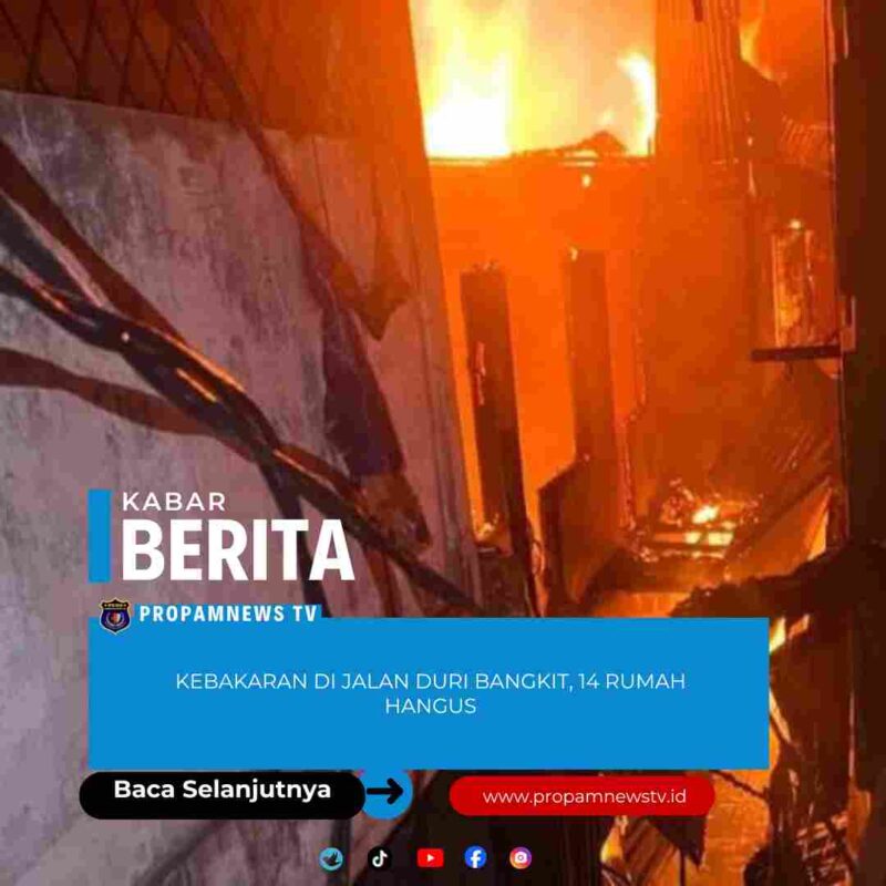 Jakarta, // PropamNewstv.id – Kebakaran hebat melanda pemukiman padat penduduk di Jalan Duri Bangkit, Jembatan Besi, Tambora, Jakarta Barat, pada Minggu pagi, 11 Januari 2026. Sebanyak 14 rumah tinggal dan satu bangunan konveksi hangus dilalap si jago merah dalam insiden yang terjadi saat warga masih beristirahat.