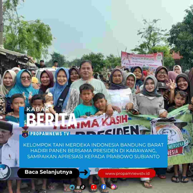 Karawang, // PropamNewstv.id – Hamparan sawah di Kabupaten Karawang menjadi saksi kebersamaan antara petani dan pemerintah pusat. Ribuan anggota Kelompok Tani Merdeka Indonesia Kabupaten Bandung Barat turut hadir dalam kegiatan panen bersama Presiden Republik Indonesia, Prabowo Subianto, sebagai bentuk rasa syukur sekaligus apresiasi atas perhatian pemerintah terhadap sektor pertanian.