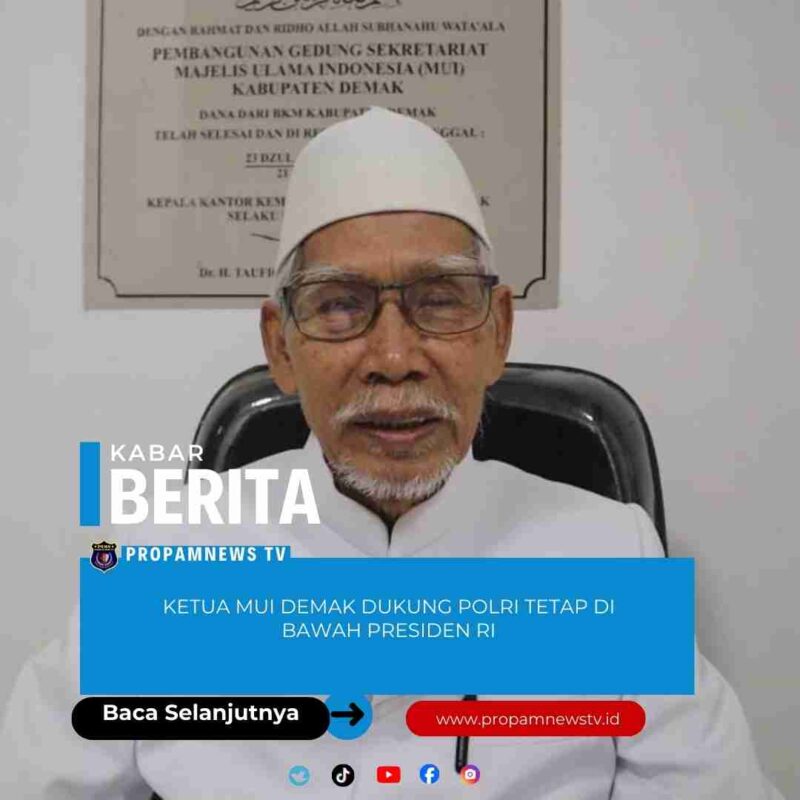 Demak, // PropamNewstv.id – Ketua Umum Majelis Ulama Indonesia (MUI) Kabupaten Demak, Drs. KH. Ahmad Ghozali, menyatakan dukungan penuh agar institusi Kepolisian Negara Republik Indonesia (POLRI) tetap berada langsung di bawah Presiden Republik Indonesia. Menurutnya posisi Polri di bawah presiden telah memberikan manfaat nyata bagi bangsa dan negara.