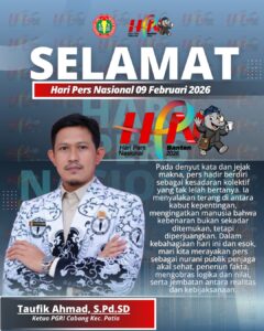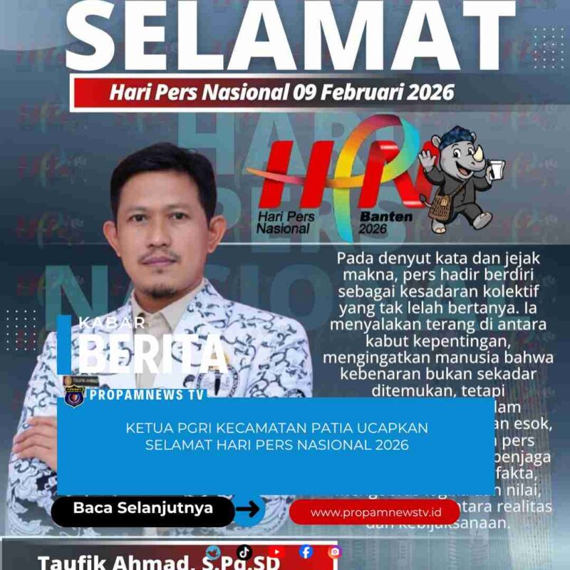 Pandeglang, Banten, // PropamNewstv.id — Ketua Persatuan Guru Republik Indonesia (PGRI) Kecamatan Patia, Kabupaten Pandeglang, Provinsi Banten, Taufik Ahmad, S.Pd.SD, menyampaikan ucapan Selamat Hari Pers Nasional (HPN) yang diperingati pada 9 Februari 2026.
