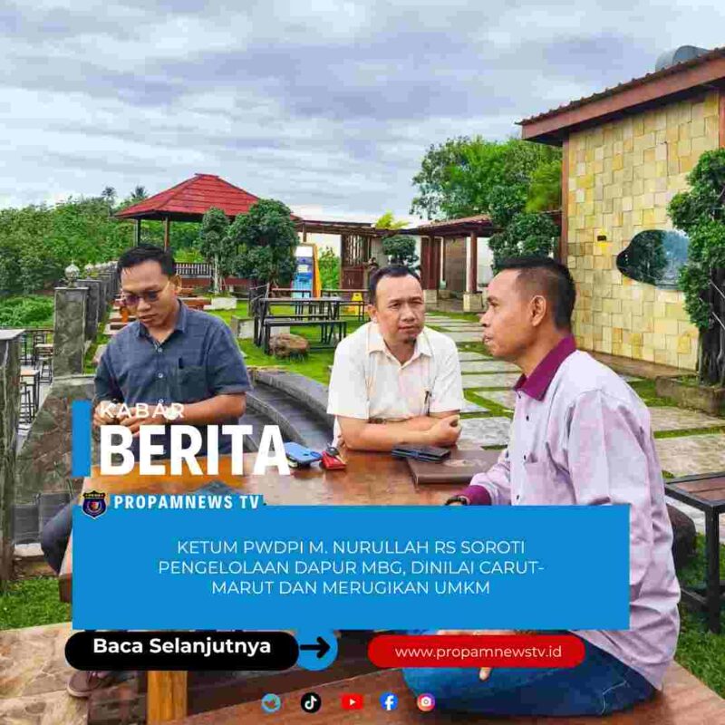 Lampung, // PropamNewstv.id – Ketua Umum Dewan Pimpinan Pusat (DPP) Persatuan Wartawan Duta Pena Indonesia (PWDPI), M. Nurullah RS, angkat bicara terkait pengelolaan dapur Makanan Bergizi Gratis (MBG) di Provinsi Lampung yang dinilai tidak berjalan dengan baik. Menurutnya, kondisi pengelolaan yang carut-marut bahkan dinilai dapat “membunuh” pelaku Usaha Mikro, Kecil, dan Menengah (UMKM) lokal.