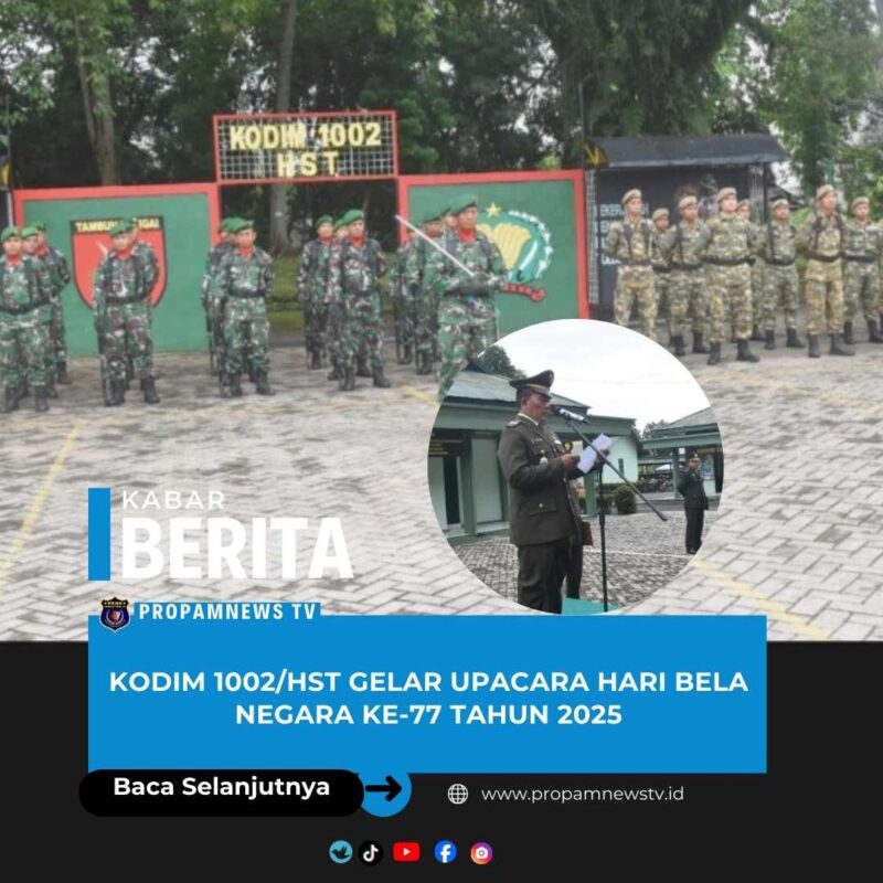 BARABAI // Propamnewstv.id – Seluruh anggota Kodim 1002/Hulu Sungai Tengah mengikuti Upacara Hari Bela Negara ke-77 Tahun 2025 yang berlangsung di lapangan apel Makodim 1002/HST, Jum’at (19/12/2025). Pada pelaksanaan upacara tersebut, Pasi Persdim 1002/HST Kapten Inf Rudi Hartono bertindak sebagai Inspektur Upacara.
