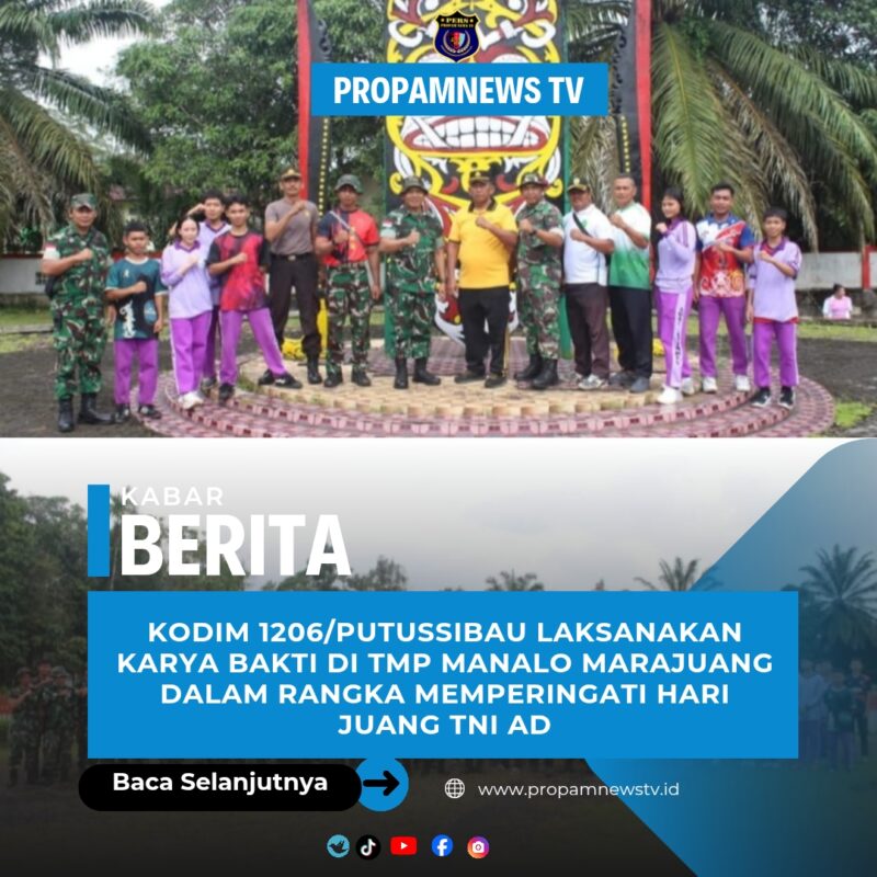 Putussibau // propamnewstv.id – Dalam rangka memperingati Hari Juang TNI AD Tahun 2025, Kodim 1206/Putussibau melaksanakan kegiatan Karya Bakti di Taman Makam Pahlawan (TMP) Manalo Marajuang, Putussibau, Selasa (09/12/2025). Kegiatan ini merupakan wujud penghormatan dan penghargaan kepada para pahlawan yang telah gugur dalam memperjuangkan kedaulatan bangsa.