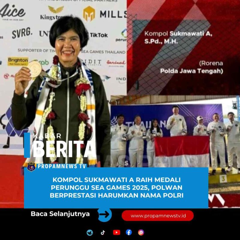 Jawa Tengah // propamnewstv.id — Kompol Sukmawati A, S.Pd., M.H., Polwan berprestasi yang saat ini menjabat sebagai Kasubbag Sisinfolap Bag RBP Rorena Polda Jawa Tengah, kembali menorehkan prestasi gemilang di tingkat internasional. Ia berhasil meraih medali perunggu cabang olahraga menembak nomor practical shooting women’s individual pada SEA Games ke-33 Tahun 2025 yang digelar di Thailand.