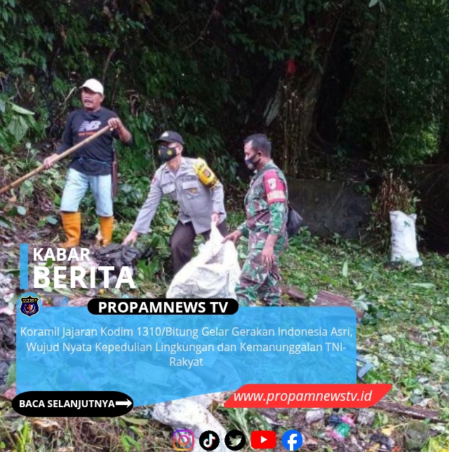 BITUNG, // PropamNewstv.id – Koramil jajaran Kodim 1310/Bitung menggelar kegiatan Gerakan Indonesia Asri sebagai wujud kepedulian terhadap kebersihan dan kelestarian lingkungan di wilayah binaan. Kegiatan tersebut dilaksanakan secara serentak oleh seluruh Koramil dengan melibatkan aparat pemerintah setempat, pelajar serta masyarakat. Rabu, (25/02/2026)