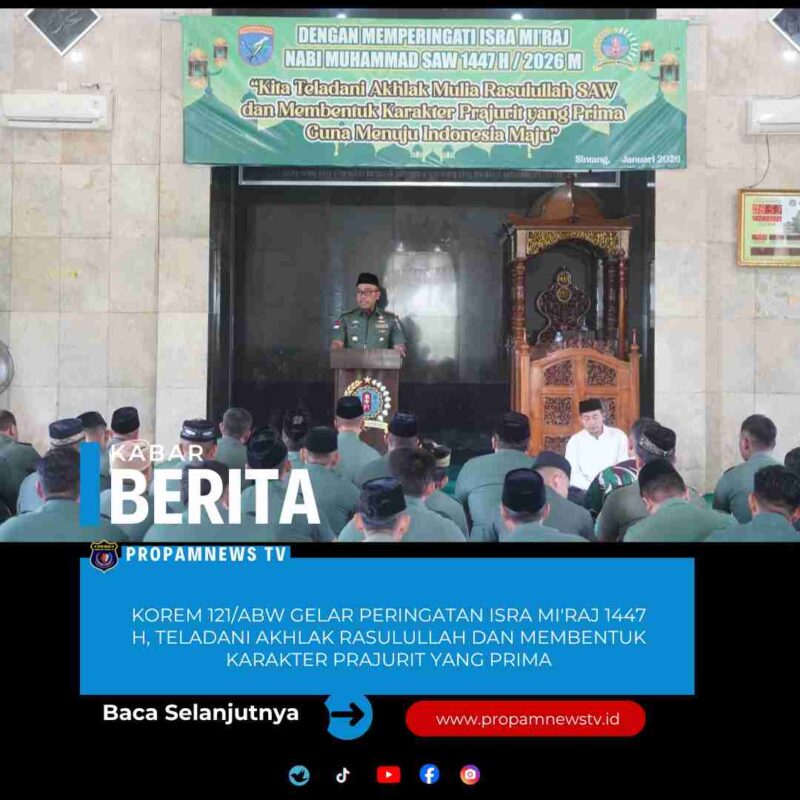 SINTANG, // PropamNewstv.id – Korem 121/Abw menggelar Pembinaan Rohani dalam rangka peringatan Isra’ Mi’raj Nabi Muhammad SAW 1447 H/2026 M dengan tema “Dengan memperingati Isra MI’raj Nabi Muhammad SAW 1447 H / 2026 M, Kita teladani akhlak mulia Rasulullah SAW dan membentuk karakter Prajurit yang prima guna menuju Indonesia Maju”, bertempat di Masjid Darul Muttaqin Korem 121/Abw, Sintang, Kalimantan Barat, Rabu (21/01/2026).