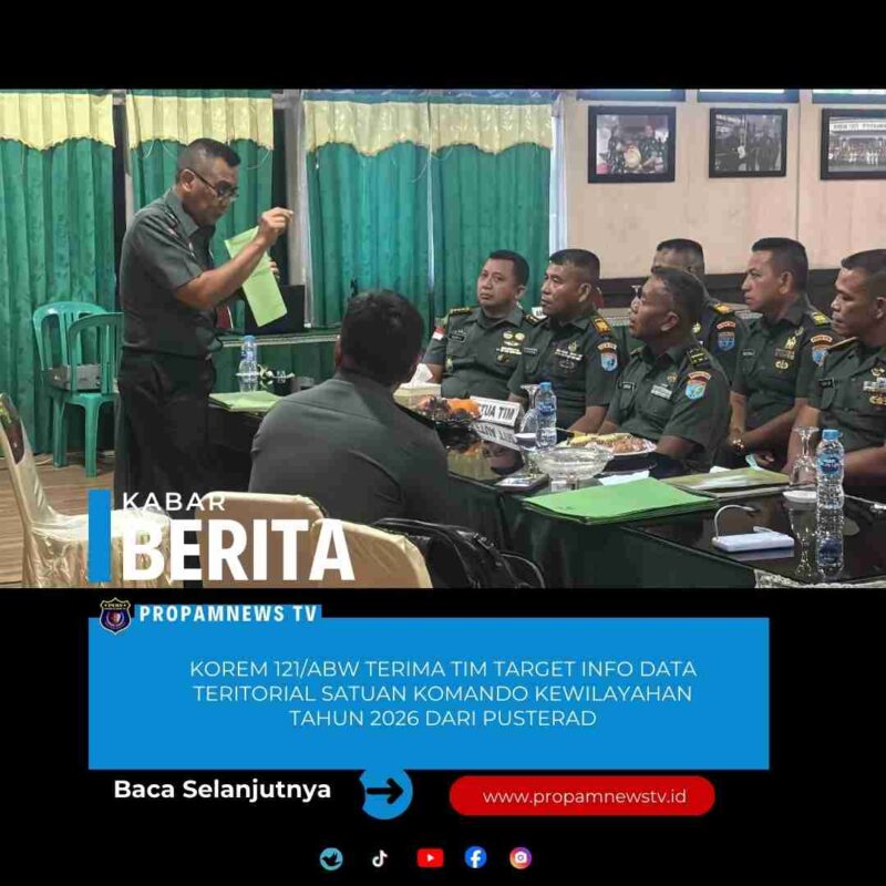 MEMPAWAH, // PropamNewstv.id – ‎Kasrem 121/Abw Kolonel Inf Dadang Ismail Marzuki, S.I.P., menyambut kedatangan Tim Target Info Data Teritorial (Satkowil) di Makodim 1201/Mempawah, Kalimantan Barat, Jumat (06/02/2026).