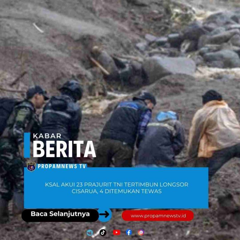 Jakarta, // PropamNewstv.id – Kepala Staf Angkatan Laut (KSAL) Laksamana Muhammad Ali membenarkan sebanyak 23 prajurit Marinir ikut tertimbun longsor disertai banjir bandang di Desa Soreang, Cisarua, Kabupaten Bandung Barat, Jawa Barat, Sabtu (24/1).