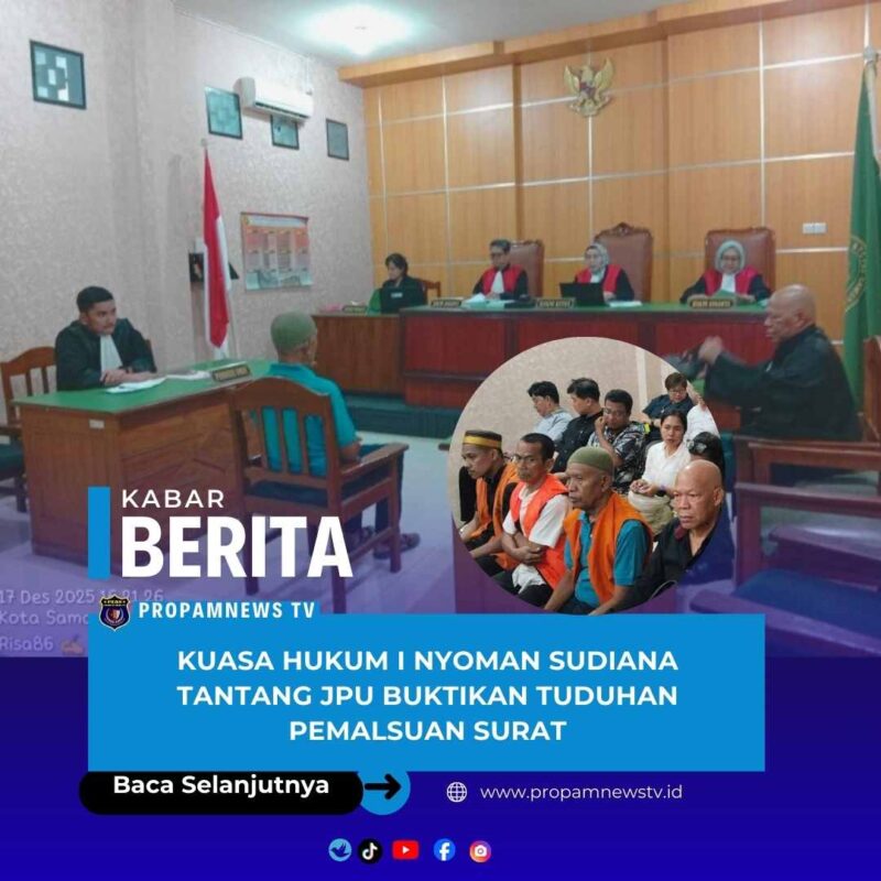 Samarinda, 17 Desember 2025 // propamnewstv.id – Kuasa hukum I Nyoman Sudiana, Rustani S.H., M.H., dari Kantor Hukum Rustani & Partners, hari ini tidak hanya membantah tuduhan pemalsuan surat terhadap kliennya, tetapi juga menantang Jaksa Penuntut Umum (JPU) untuk membuktikan dasar dan bukti yang mereka miliki. Pernyataan ini dikeluarkan menyusul putusan sela Pengadilan Negeri Samarinda yang menolak eksepsi yang diajukan tim pembela hukum.