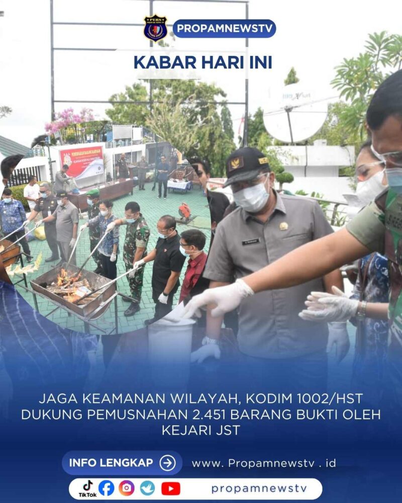 BARABAI//propamnewstv.id – Komandan Kodim 1002/HST Letkol Inf Ardiansyah Okta Putra turut menghadiri kegiatan pemusnahan barang bukti dan barang rampasan yang telah berkekuatan hukum tetap di halaman Kejaksaan Negeri Hulu Sungai Tengah (HST), Kamis (04/12/2025)