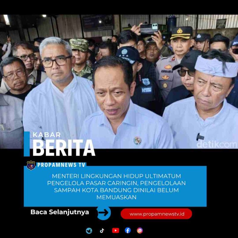 Bandung, // PropamNewstv.id — Menteri Lingkungan Hidup Hanif Faisol mengeluarkan ultimatum tegas kepada pengelola Pasar Caringin, Kota Bandung. Jika dalam waktu dua pekan persoalan persampahan tidak ditangani secara serius, Hanif menegaskan akan menggunakan kewenangannya untuk menjerat pengelola dengan sanksi pidana sesuai peraturan perundang-undangan.