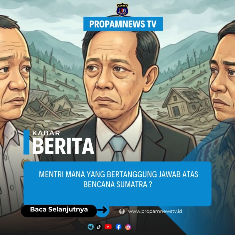 Jakarta//propamnewstv.id– Banjir dan longsor di Sumatra telah menimbulkan pertanyaan tentang siapa yang paling bertanggung jawab. Sugiyanto Emik, pengamat kebijakan publik, menunjuk lima menteri yang perlu dimintai pertanggungjawaban, yaitu Menteri ESDM Bahlil Lahadalia, Menteri Kehutanan Raja Juli Antoni, Menteri Lingkungan Hidup Hanif Faisol Nurofiq, Menteri Agraria dan Tata Ruang/Kepala BPN Nusron Wahid, dan Menteri PUPR Dody Hanggodo.