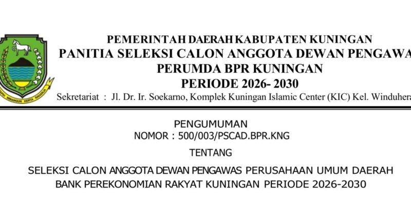 KUNINGAN,//PropamNewsTv.id/– Pemerintah Daerah Kabupaten Kuningan membuka seleksi terbuka calon Anggota Dewan Pengawas Perusahaan Umum Daerah Bank Perekonomian Rakyat (Perumda BPR) Kuningan periode 2026–2030.
