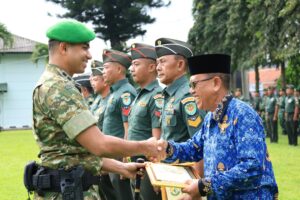 Momen ini menyatu dalam pelantikan kenaikan pangkat Bintara dan Tamtama periode 1 April 2026 sekaligus wisuda purna tugas militer dan PNS yang dipimpin langsung oleh Dandim 0615/Kuningan, Letkol Arh Hafda Prima Agung, S.I.P., M.Sc., M.Si.