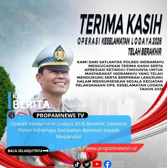 INDRAMAYU, // PropamNewstv – Operasi Keselamatan Lodaya Tahun 2026 resmi berakhir. Satuan Lalu Lintas (Satlantas) Polres Indramayu menyampaikan ucapan terima kasih sekaligus apresiasi kepada seluruh masyarakat yang telah mendukung pelaksanaan operasi tersebut sehingga berjalan dengan aman dan lancar.