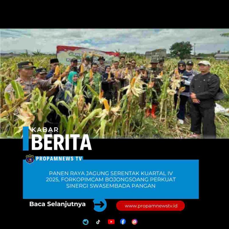 Bojongsoang, // PropamNewstv.id – Pemerintah Kecamatan Bojongsoang bersama Forum Koordinasi Pimpinan Kecamatan (Forkopimcam) Bojongsoang melaksanakan kegiatan Panen Raya Jagung Serentak Kuartal IV Tahun 2025 yang bertempat di Desa Buahbatu, Kamis, 8 Januari 2026. Pada kegiatan ini, jenis jagung yang dipanen adalah jagung pipil.