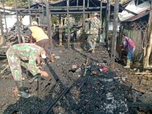 Di lokasi kejadian, personel TNI bersama Polri, BPBD, serta relawan bahu-membahu membersihkan sisa material bangunan yang terbakar guna mempercepat proses pemulihan lingkungan.