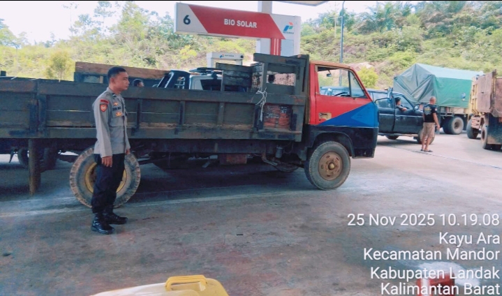 LANDAK//propamnewstv.id – Situasi antrian di SPBU Kayu Ara Kecamatan Mandor Kabupaten Landak tampak ramai siang ini. Sejumlah pengendara roda dua hingga kendaraan angkutan barang memenuhi area pengisian bahan bakar. Di tengah aktivitas tersebut personel Polsek Mandor melaksanakan patroli siang sekaligus memberikan himbauan kamtibmas kepada warga dan karyawan SPBU. Selasa,(25/11/2025).
