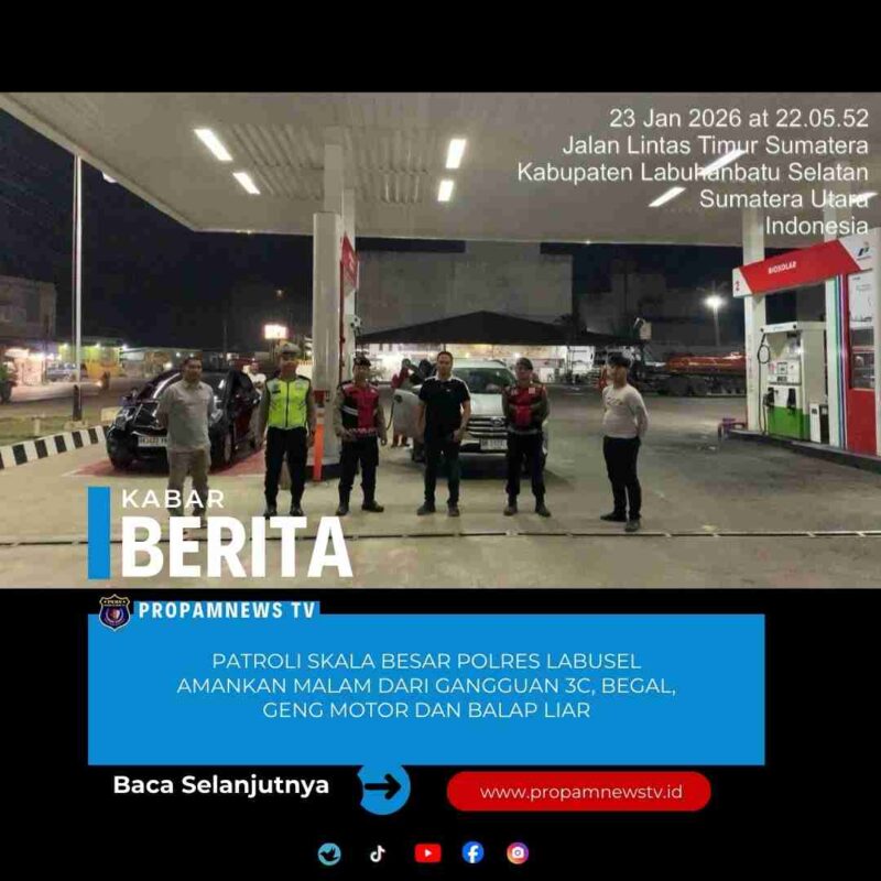 Labuhanbatu, // PropamNewstv.id – Polres Labuhanbatu Selatan kembali menggelar Patroli Skala Besar guna mengantisipasi kejahatan jalanan 3C (Curat, Curas, dan Curanmor), serta mencegah aksi geng motor, tawuran, dan balap liar, pada Jumat malam, 23 Januari 2026, mulai pukul 21.00 WIB hingga 22.45 WIB. Hasilnya, situasi wilayah hukum Polres Labuhanbatu Selatan terpantau aman dan kondusif.