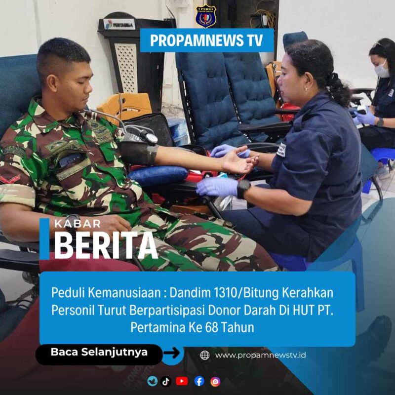 BITUNG//propamnewstv.id – Dalam rangka memperingati Hari Ulang Tahun (HUT) PT. Pertamina (Persero) yang ke-68, personel Kodim 1310/Bitung menunjukkan aksi bakti sosial donor darah yang bertempat di Aula PT. Pertamina (Persero) Fuel Terminal BitungKel. Bitung Tengah Kec. Maesa Kota Bitung. Selasa, (9/12/2025).