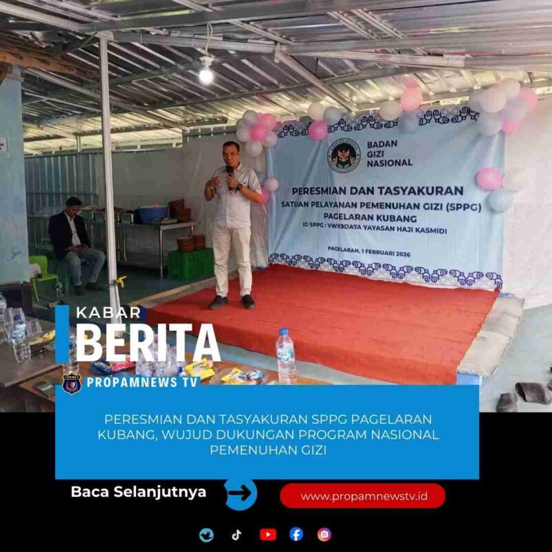 Pandeglang // PropamNewstv.id – Satuan Pelayanan Pemenuhan Gizi (SPPG) Pagelaran Kubang dengan ID SPPG: VWX9DA7A resmi diresmikan pada Senin, 1 Februari 2026, bertempat di Dapur MBG yang beralamat di Kampung Kubang, Desa Surakarta, Kecamatan Pagelaran, Kabupaten Pandeglang, Provinsi Banten.minggu (1/2/2026).