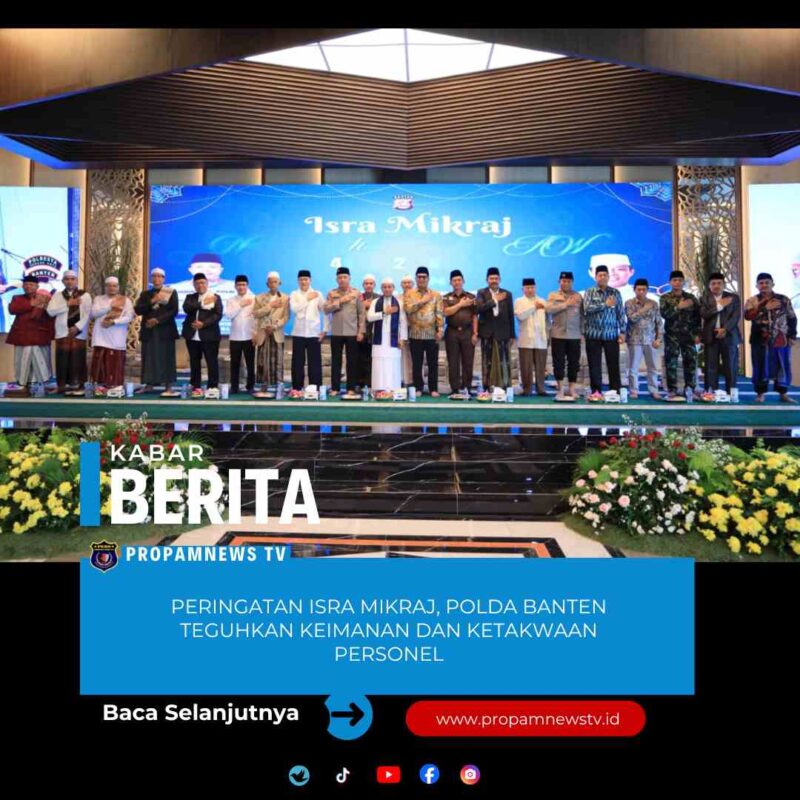 Serang //propamnewstv.id – Polda Banten menggelar peringatan Isra Mikraj Nabi Muhammad SAW yang mengusung tema “Isra Mikraj Nabi Besar Muhammad SAW memperteguh keimanan dan ketakwaan personel Polri untuk masyarakat dalam aksi kemanusiaan dan kepedulian sosial”. Kegiatan tersebut bertempat di Aula Gawekuta Baluarti Polda Banten pada Kamis (22/01).