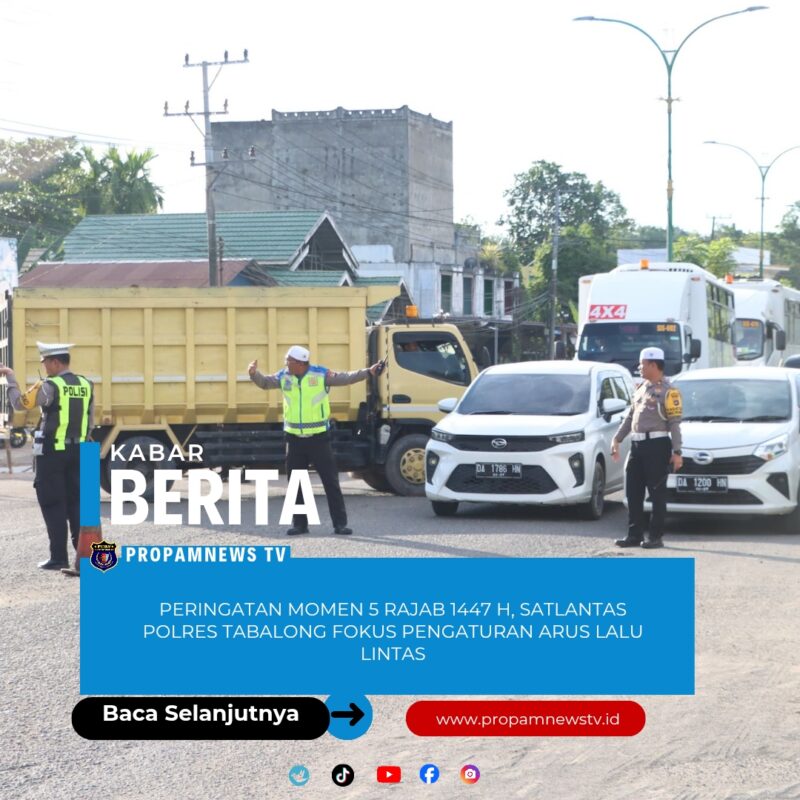 Tabalong //propamnewstv.id – Satuan Lalu Lintas (Satlantas) Polres Tabalong melaksanakan kegiatan pengaturan arus lalu lintas dalam rangka peringatan momen 5 Rajab 1447 Hijriah, yang bertempat di Simpang Empat Islamic Center, Kelurahan Mabuun, Kecamatan Murung Pudak, Kabupaten Tabalong, pada Jumat (26/12/2025) sore.