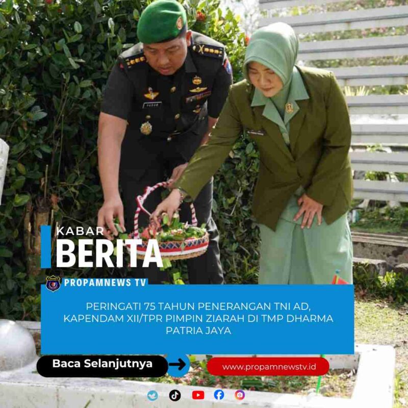 KUBU RAYA, // PropamNewstv.id – Dalam rangka memperingati tonggak sejarah 75 tahun pengabdian Penerangan TNI Angkatan Darat, Kepala Penerangan Kodam (Kapendam) XII/Tanjungpura, Kolonel Inf Yusub Dody Sandra, S.I.P., M.I.Pol., memimpin langsung ziarah rombongan di Taman Makam Pahlawan (TMP) Dharma Patria Jaya, Sungai Raya, Kabupaten Kubu Raya, Selasa (13/1/2026).