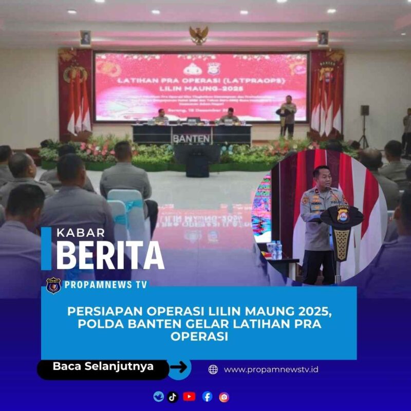 Serang // propamnewstv.id — Polda Banten menggelar Latihan Pra Operasi Lilin Maung 2025 dengan tema “Melalui Pelatihan Pra Operasi Kita Tingkatkan Kemampuan dan Profesionalisme Polri delam Pengamanan Natal 2025 dan Tahun Baru 2026 Guna Memelihara Keamanan Dalam Negeri”. Yang bertempat di Aula Serba Guna Polda Banten pada Kamis (18/12).