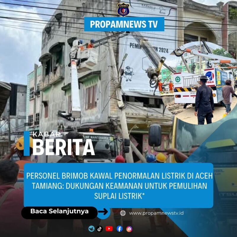 Aceh//propamnewstv.id – Personel Brimob Polda Aceh dikerahkan untuk memastikan proses penormalan jaringan listrik pascabanjir di Aceh Tamiang berjalan aman, cepat, dan tanpa gangguan. Dukungan keamanan ini penting agar PLN dapat mempercepat pemulihan suplai listrik bagi masyarakat di pengungsian maupun wilayah yang masih terdampak.