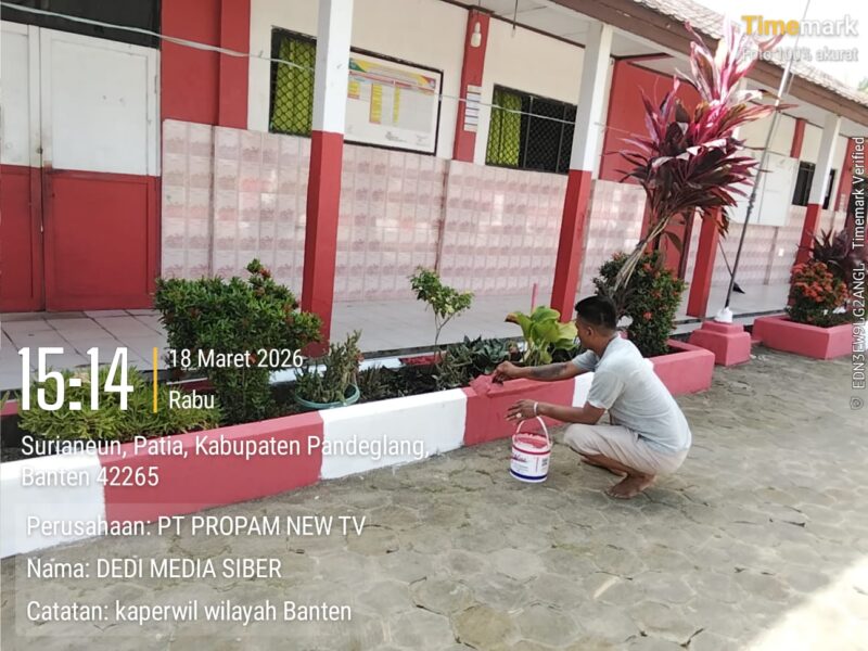 Pandeglang – //PropamNewsTv.id-Di tengah suasana libur sekolah yang biasanya identik dengan berhentinya aktivitas pendidikan, semangat pengabdian justru tetap terlihat di SDN Surianeun 1, yang berlokasi di Desa Surianeun, Kecamatan Patia, Kabupaten Pandeglang. Pada Rabu (18/3/2026), sejumlah petugas penjaga dan kebersihan sekolah tampak sibuk melakukan pengecatan di berbagai sudut bangunan sekolah guna menciptakan lingkungan belajar yang lebih rapi, bersih, dan nyaman bagi para siswa.
