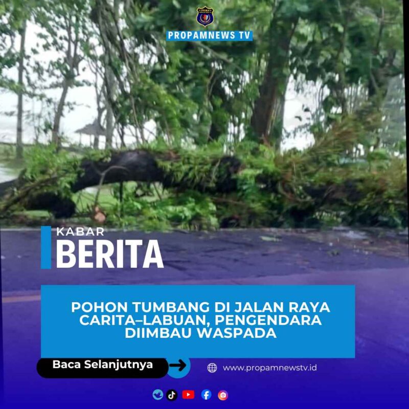 Pandeglang Selasa ( 16/12/2025 ) // propamnewstv.id — Telah terjadi pohon tumbang di jalan raya Carita labuan, Sukarame km 12 Sukarame kecamatan Carita kabupaten Pandeglang terlah di jumpai seorang narasumber suritno mengatakan pas kejadian pohon tumbang tersebut sekitar jam 12:00 dini hari tadi dan untung tidak menimpah pengendara yang lewat dan tidak ada korban jiwa , untuk pengendara yg melintasi jalan Carita di mohon untuk berhati-hati karena banyaknya pohon besar di pinggir jln tersebut dan cuaca yang kurang memungkinkan.