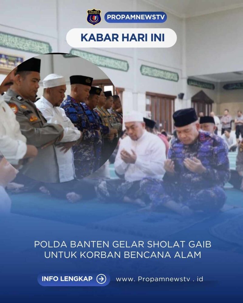Serang, (03/01/12) // propamnewstv.id – Kepolisian Daerah Banten menggelar Sholat Gaib sebagai bentuk kepedulian, empati, dan solidaritas atas musibah bencana alam yang melanda sejumlah wilayah di Provinsi Aceh, Sumatera Barat, dan Sumatera Utara.