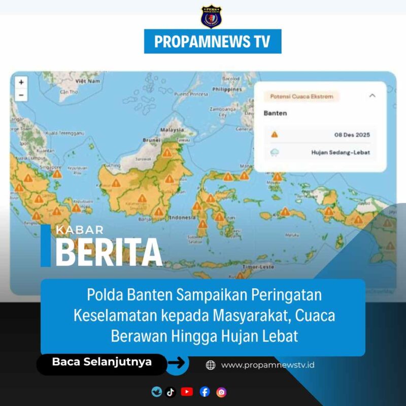 Serang // propamnewstv.id Polda Banten kembali mengimbau masyarakat untuk meningkatkan kewaspadaan terhadap potensi cuaca ekstrem berdasarkan pembaruan informasi dari Badan Meteorologi Klimatologi dan Geofisika (BMKG) per Senin (08/12). BMKG memprakirakan sebagian besar wilayah Provinsi Banten berpotensi mengalami hujan dengan intensitas sedang hingga lebat.