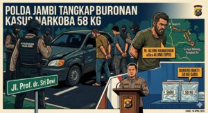 JAMBI //propamnewstv.id/– Direktorat Reserse Narkoba (Ditresnarkoba) Polda Jambi berhasil mengamankan M. Alung Ramadhan alias Alung, seorang pria yang masuk dalam Daftar Pencarian Orang (DPO) terkait dugaan kasus peredaran narkotika jenis sabu seberat 58 kg. Penangkapan ini mengakhiri pelarian Alung yang sempat buron selama enam bulan.
