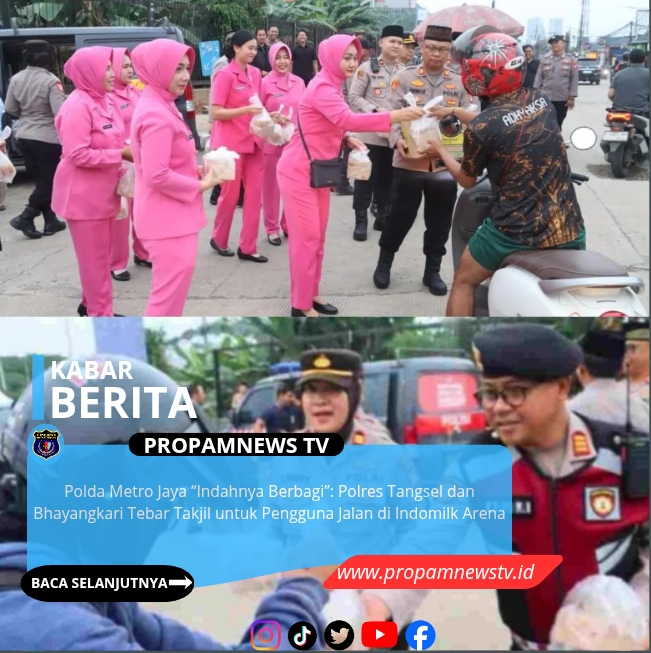 Tangerang Selatan, // PropamNewstv.id-Semangat berbagi di bulan suci Ramadhan kembali ditunjukkan jajaran Polda Metro Jaya melalui kegiatan sosial bertajuk Indahnya Berbagi. Kali ini, aksi kepedulian tersebut diwujudkan oleh Polres Tangerang Selatan bersama Bhayangkari dengan membagikan ratusan paket takjil kepada masyarakat dan pengguna jalan di depan Indomilk Arena, wilayah Kelapa Dua, Kota Tangerang Selatan.